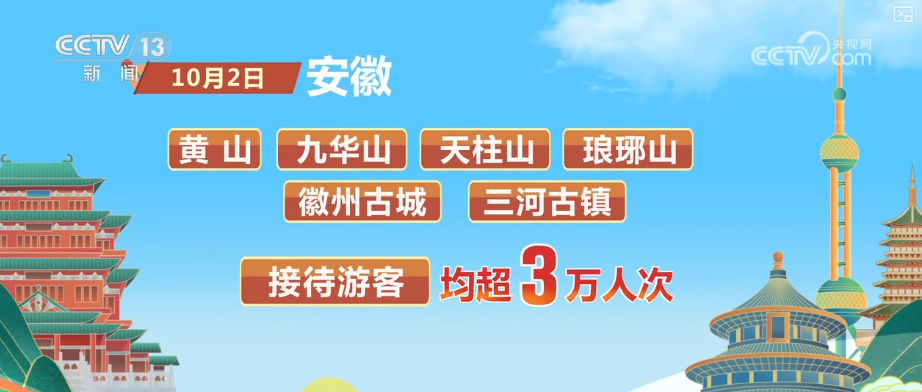 黄山、九华山、天柱山、琅琊山、徽州古城、三河古镇接待游客均超3万人次。