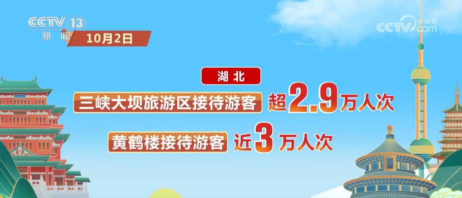 其中,三峡大坝旅游区延续热门态势,10月2日接待游客突破2.9万人次。黄鹤楼10月2日接待游客近3万人次,登楼观江、诗词打卡成为主流体验,夜间灯光秀一票难求。