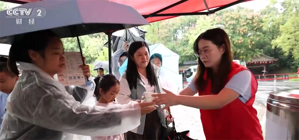 在湖北襄阳古隆中景区,工作人员提前熬煮好姜汁可乐装入纸杯,有序分发给游客,游客们手捧热饮,驱散了秋雨的寒意。为了最大程度减少雨天对出游体验的影响,景区还组织志愿者开展流动服务,为游客免费发放雨衣,同时放置了多台吹风机与暖风机,方便游客及时烘干淋湿的头发和衣物。