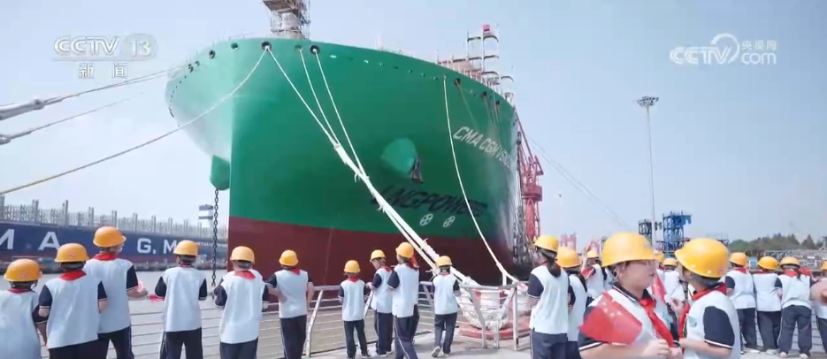 跟随观光车,研学师生们踏上了江南造船的码头。伴随着生产现场机器的轰鸣声,在巨型龙门吊下,正在船坞内紧张建造的大型集装箱船、液化气运输船呈现眼前。从一块钢板的切割、成型,到万吨巨轮的合拢、下水,给大家带来沉浸式的硬核体验。
