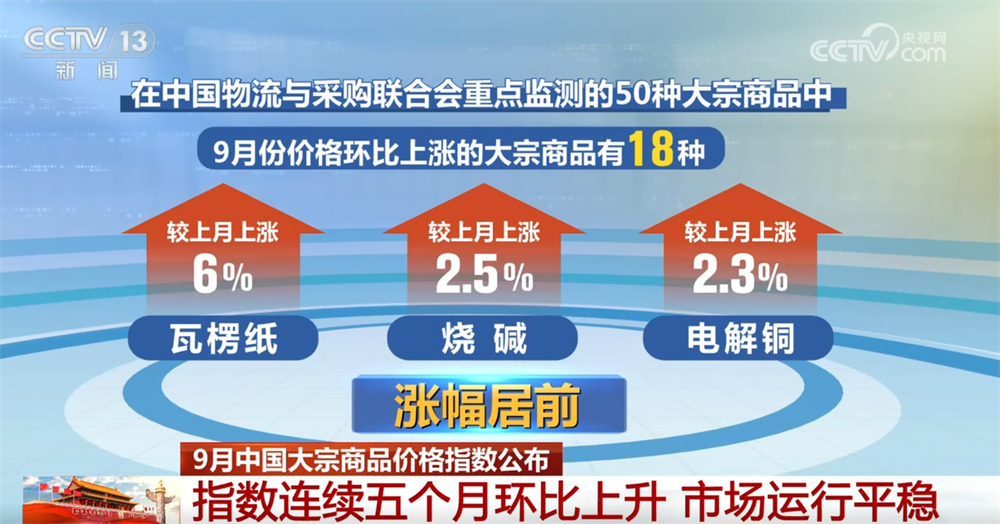 在中国物流与采购联合会重点监测的50种大宗商品中,9月份价格环比上涨的大宗商品有18种。其中,瓦楞纸、烧碱和电解铜涨幅居前,较上月分别上涨6%、2.5%和2.3%。