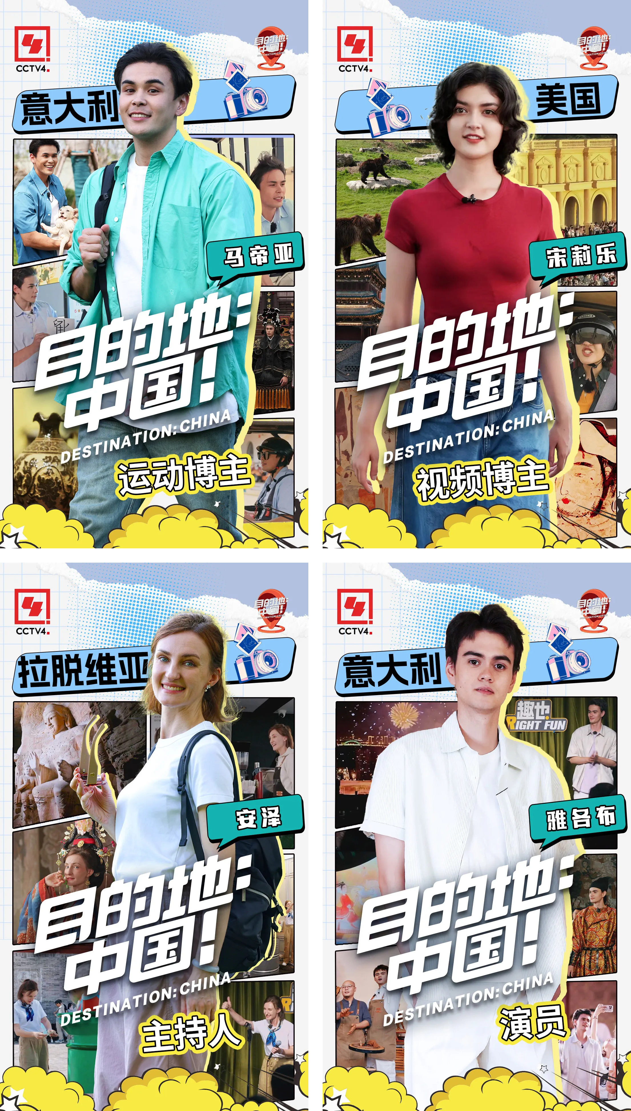 《目的地:中国!》的外籍免签探路官中,有意大利演员雅各布、美国视频博主宋莉乐、拉脱维亚主持人安泽以及意大利运动达人马帝亚等,他们来到中国开启探索之旅,以外国人的视角向全球观众展现真实、立体、多元的中国。