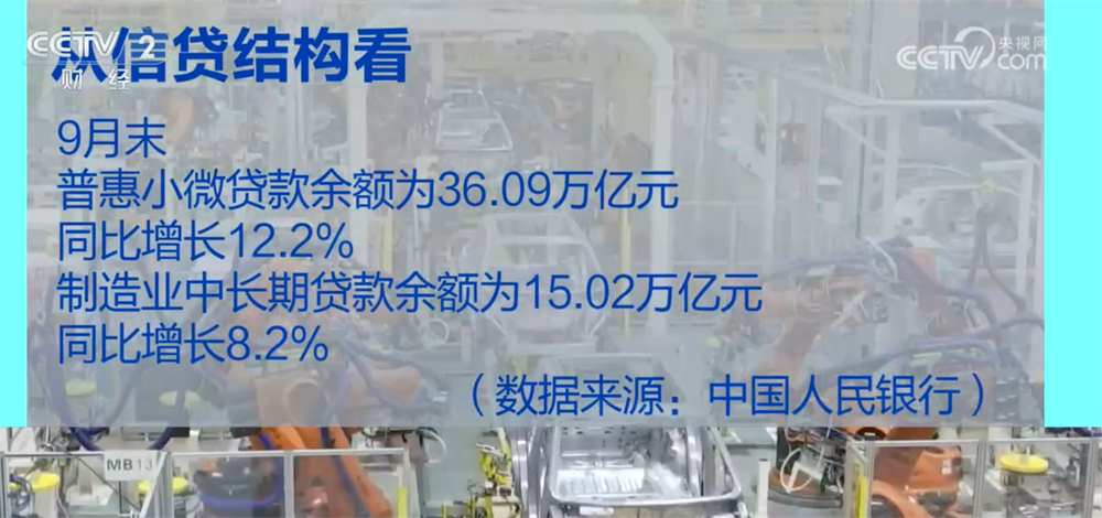 从信贷结构看,9月末,普惠小微贷款余额为36.09万亿元,同比增长12.2%,制造业中长期贷款余额为15.02万亿元,同比增长8.2%,均高于人民币贷款同比增速。