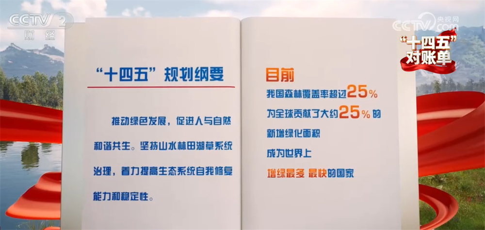 “十四五”规划纲要提出,推动绿色发展,促进人与自然和谐共生。坚持山水林田湖草系统治理,着力提高生态系统自我修复能力和稳定性。这五年,我国共完成了国土绿化面积5.49亿亩,其中造林面积1.85亿亩,相当于一个福建省,新增森林蓄积量相当于一个大兴安岭林区。目前我国森林覆盖率超过25%,为全球贡献了大约25%的新增绿化面积,成为世界上增绿最多、最快的国家。