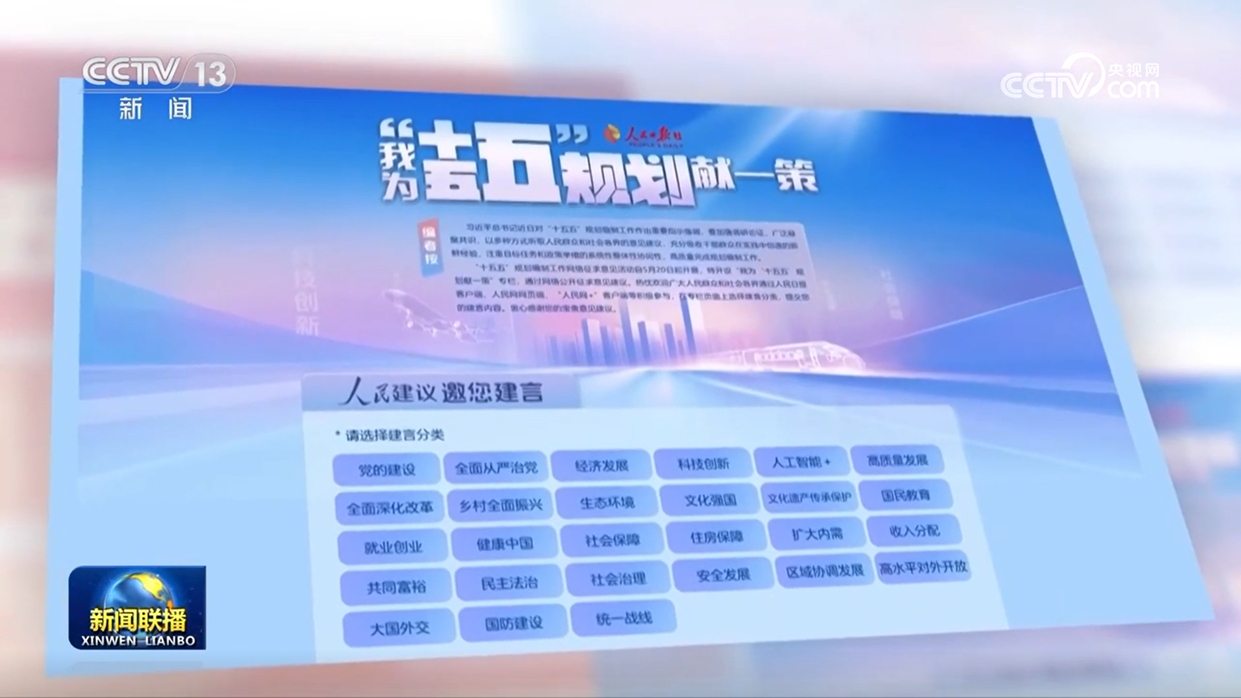 察民情、听民声、汇民智。今年5月到6月,“十五五”规划编制工作开展网络征求意见活动。一个月时间里,累计收到网民建言超过311.3万条。从建言主题来看,新增了“人工智能+”“文化遗产传承保护”等多个板块,充分听取百姓各方面诉求和多层次需要,增强规划编制的科学性和民主性。