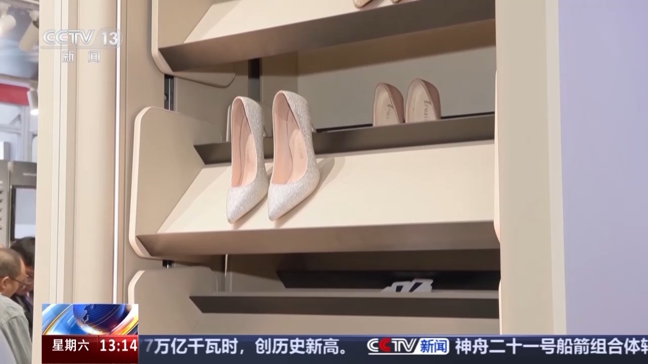 在家具展区,一款摩天轮鞋柜也吸引了很多海外客商的注意。轻触柜面之后,整个静止的鞋柜就开始运动了起来。原因就在于它内置有一个电动升降系统,当鞋柜转起来之后,我们取物也变得更加方便了。当您想取物的时候,手伸进去,红外系统将会自动为您暂停鞋柜的运动。