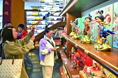 甘肃敦煌,游客在敦煌书局观看国潮产品。新华社发
