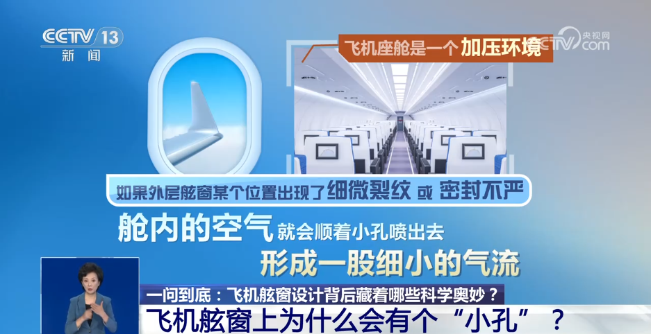 刘建辉:飞机窗户有三层,最外层叫结构层,它承载了大概在巡航高度上90%的压力,中间层承担一部分的压力,它主要的作用是保护外层。靠近旅客的这层就是装饰层、防磨层。在空中的时候外界气压是比较低的,大概0.2个帕,小洞其实就叫泄压保护孔,内外压差比较大,小孔的话就会平衡内层跟外层的一个压力。