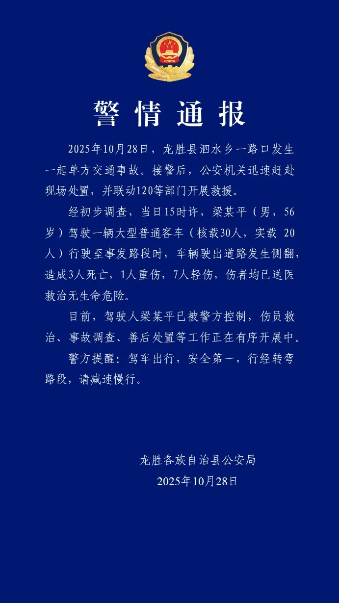 目前,驾驶人梁某平已被警方控制,伤员救治、事故调查、善后处置等工作正在有序开展中。