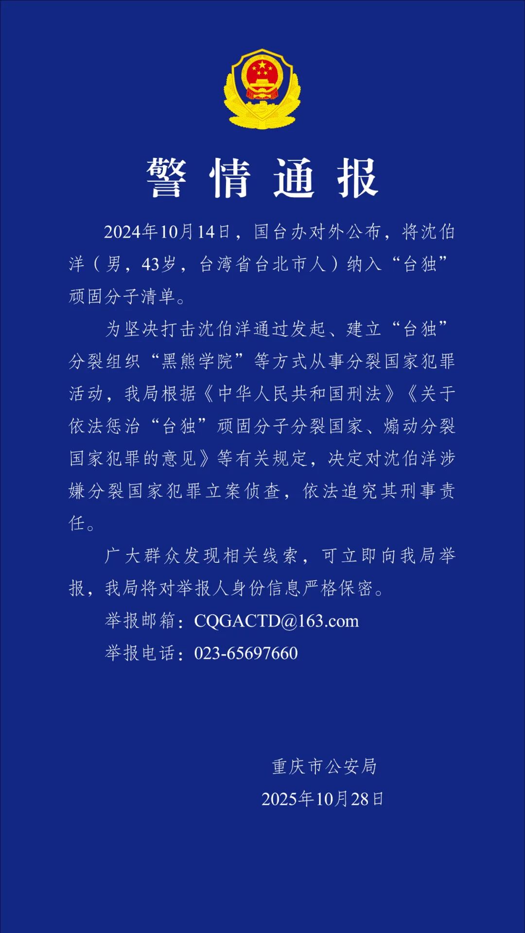 央视网消息:据平安重庆微信公众号消息,重庆市公安局28日发布警情通报,2024年10月14日,国台办对外公布,将沈伯洋(男,43岁,台湾省台北市人)纳入“台独”顽固分子清单。