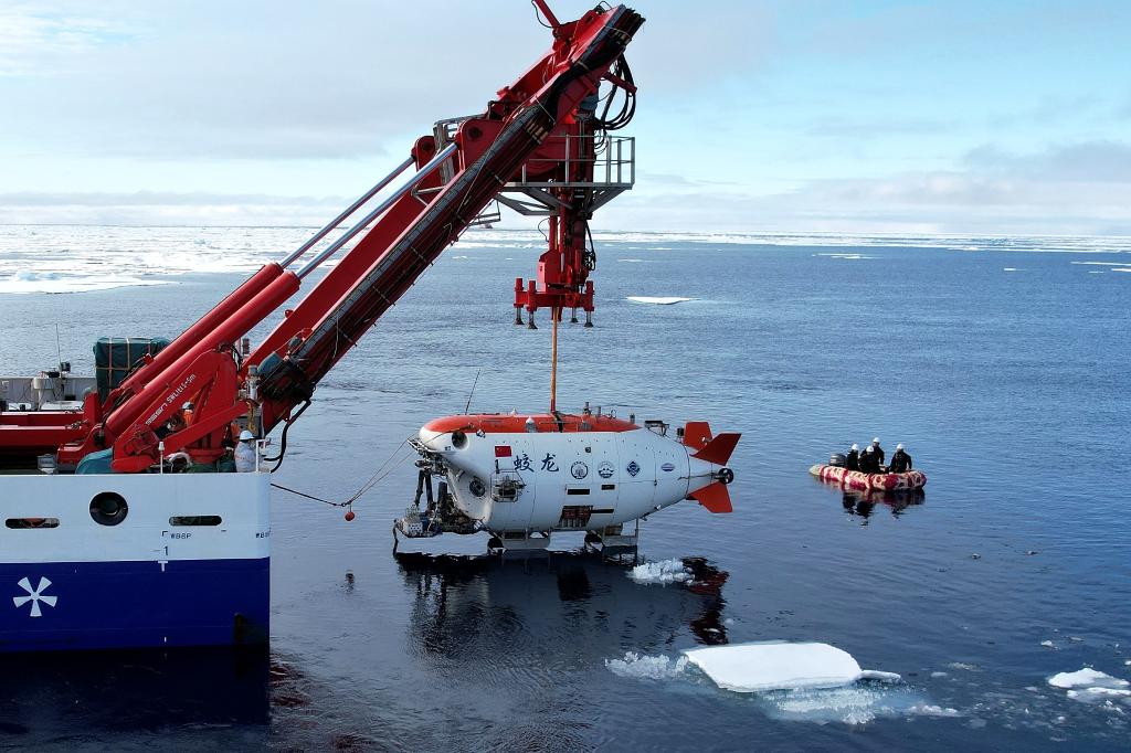“奋斗者”号在北极密集冰区进行回收。(自然资源部供图)