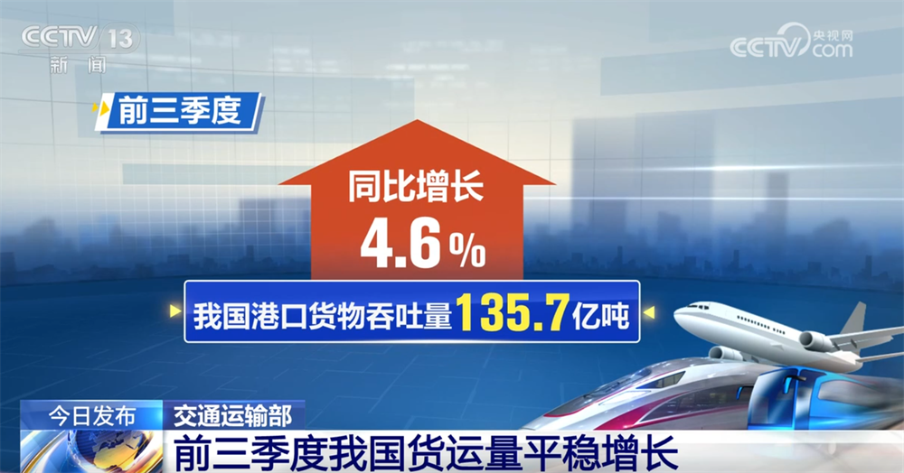 央视网消息:10月29日,交通运输部举行例行新闻发布会,发布今年前三季度行业相关运行数据。数据显示,前三季度,我国货运量平稳增长,跨区域人员流动量持续增加。