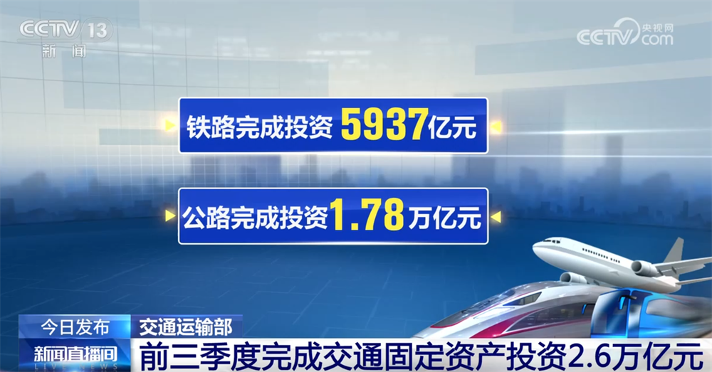 最新数据显示,今年前三季度,我国完成交通固定资产投资2.6万亿元。分方式看,铁路完成投资5937亿元;公路完成投资1.78万亿元,其中高速公路、普通国省道、农村公路分别完成投资9296亿元、4343亿元和2753亿元;水路完成投资1605亿元;民航完成投资829亿元。