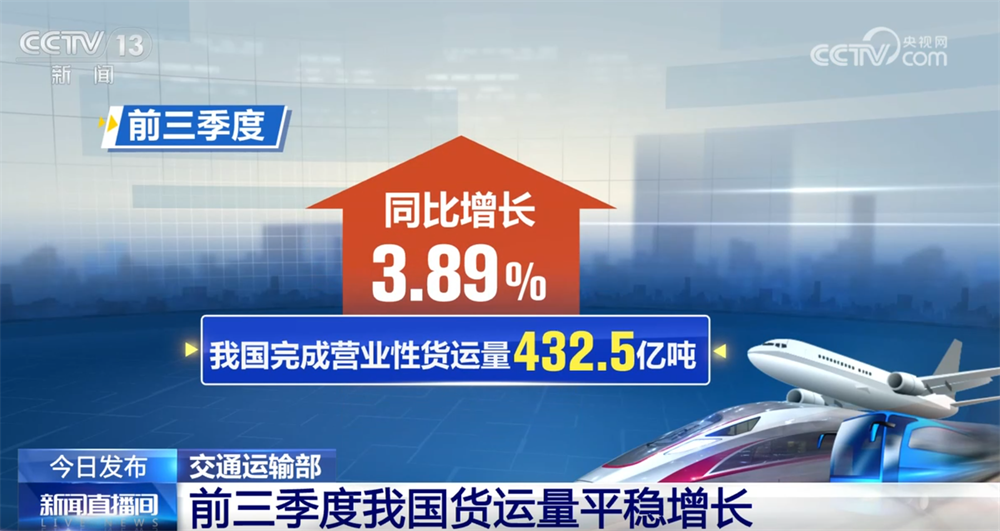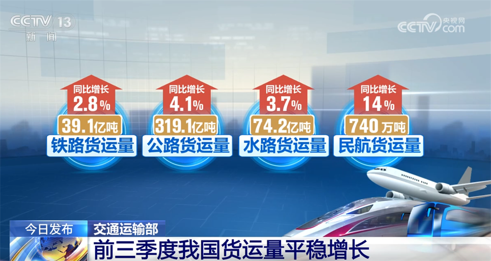 交通运输部数据显示,前三季度我国完成营业性货运量432.5亿吨,同比增长3.89%。铁路、公路、水路、民航货运量分别完成39.1亿吨、319.1亿吨、74.2亿吨和740万吨,同比分别增长2.8%、4.1%、3.7%和14%。