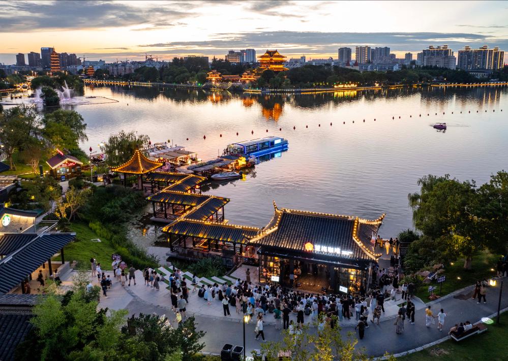 6月28日,人们在江苏省泰州市海陵区桃园景区游玩(无人机照片)。桃园位于江苏省泰州市凤城河风景区东岸,东接泰州老街,是当地城市八景之一。新华社发(汤德宏 摄)