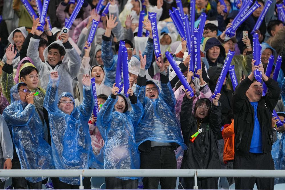 10月18日,泰州队球迷在“苏超”半决赛赛场边加油助威。半决赛中,南京队主场与泰州队在常规时间1比1战平,通过点球大战,泰州队以9比8的总比分战胜南京队,晋级决赛。新华社记者 李博 摄
