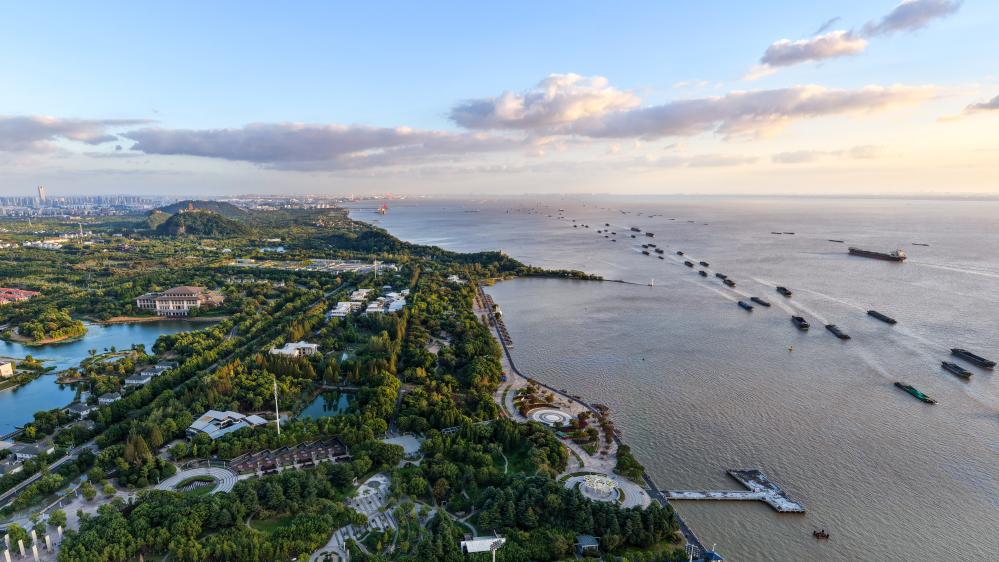 这是江苏省南通市狼山国家森林公园沿江景色(10月23日摄,无人机照片)。新华社记者 李博 摄