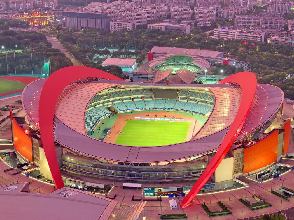 这是7月4日无人机拍摄的夕阳下的南京奥体中心。新华社发(许丛军 摄)