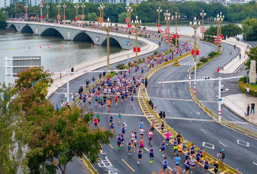 10月19日,参赛选手在2025泰州马拉松比赛中(无人机照片)。新华社发(汤德宏 摄)