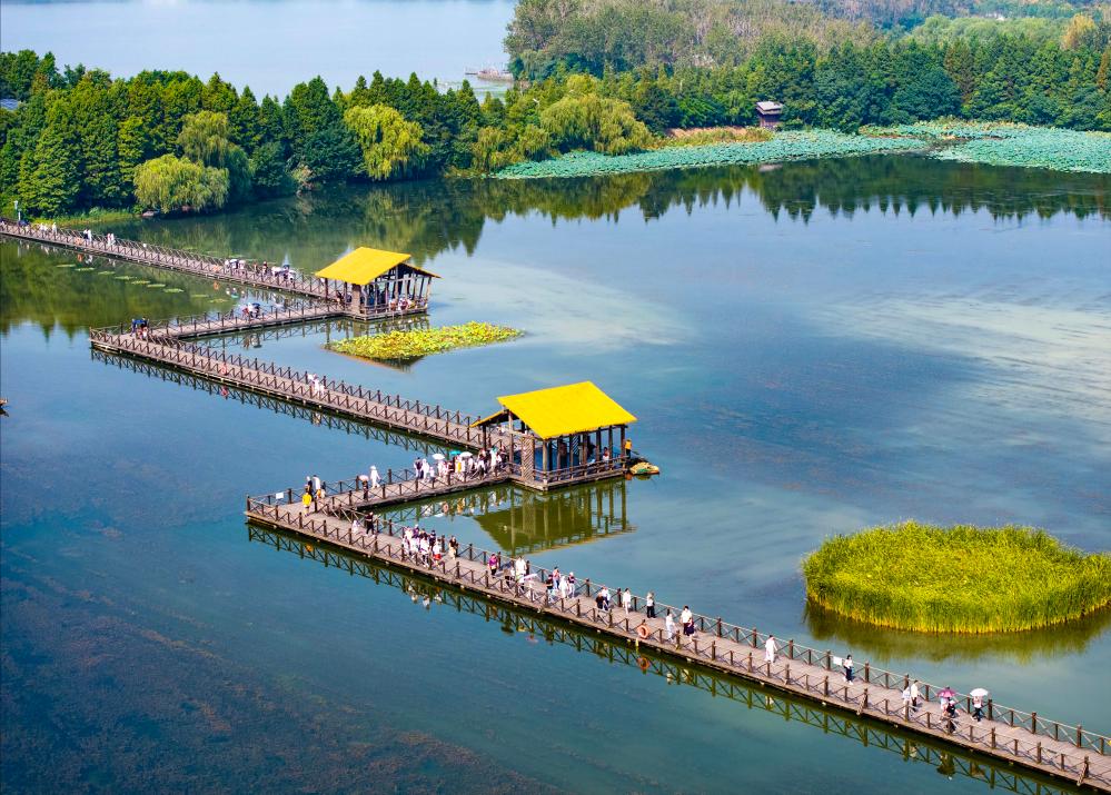 10月6日,游客在江苏省泰州市姜堰区溱湖国家湿地公园游玩(无人机照片)。溱湖国家湿地公园位于城市东北郊,拥有大片水域和纵横河道,可漫步木栈道、乘船游览。新华社发(汤德宏 摄)