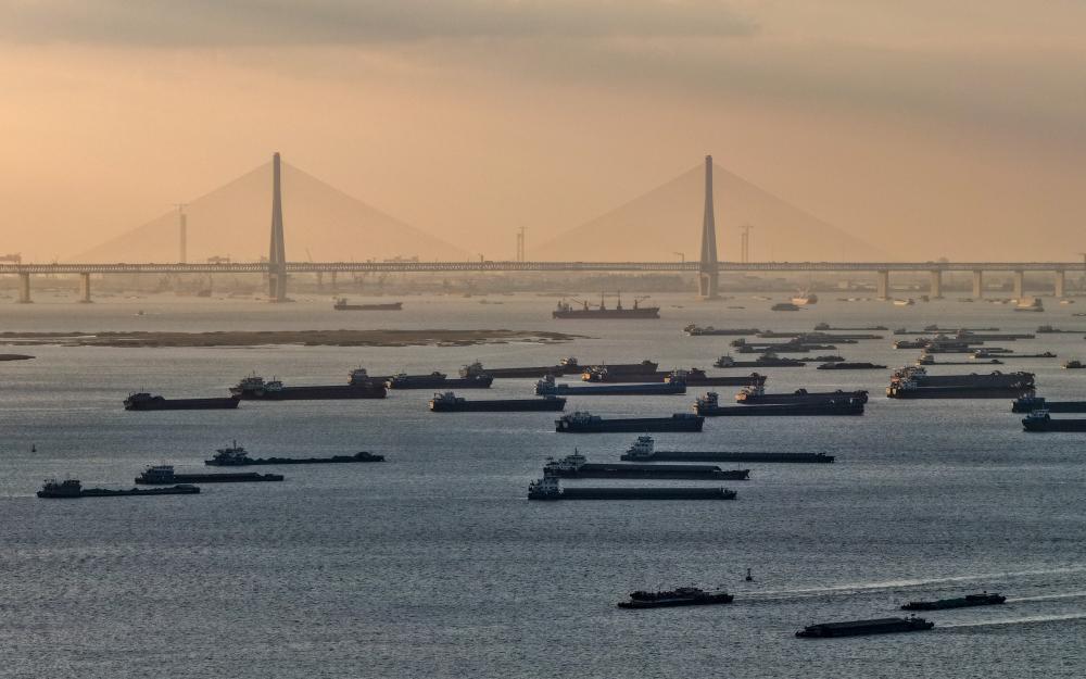 船只在长江江苏南通段航行(10月23日摄,无人机照片)。新华社记者 李博 摄