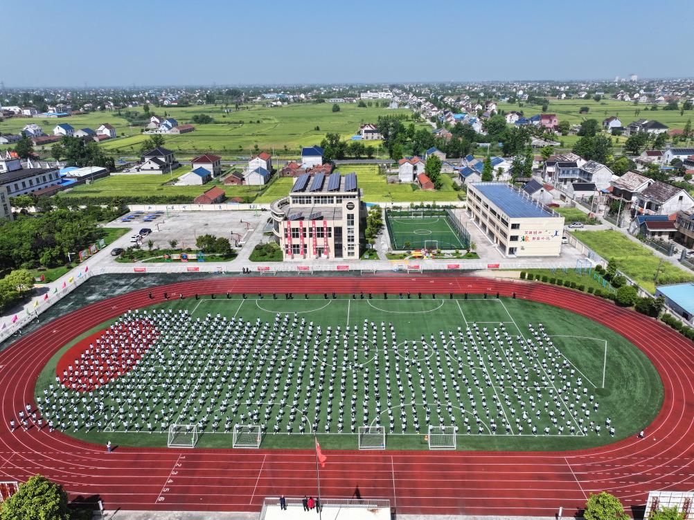 2024年5月13日,在首批“全国中小学校园足球特色学校”江苏省如东县岔河小学拍摄的学生足球技能全员展示活动(无人机照片)。新华社发(许丛军 摄)