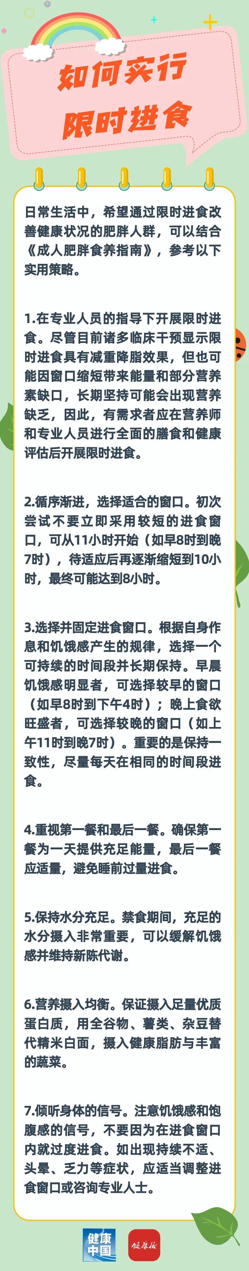 因此,理想的限时进食应当同时重视进食窗口的时间规划与进食窗口内的饮食质量,即在符合人体昼夜节律的进食窗口内,选择营养全面的食物和营养素,保持健康的膳食结构。