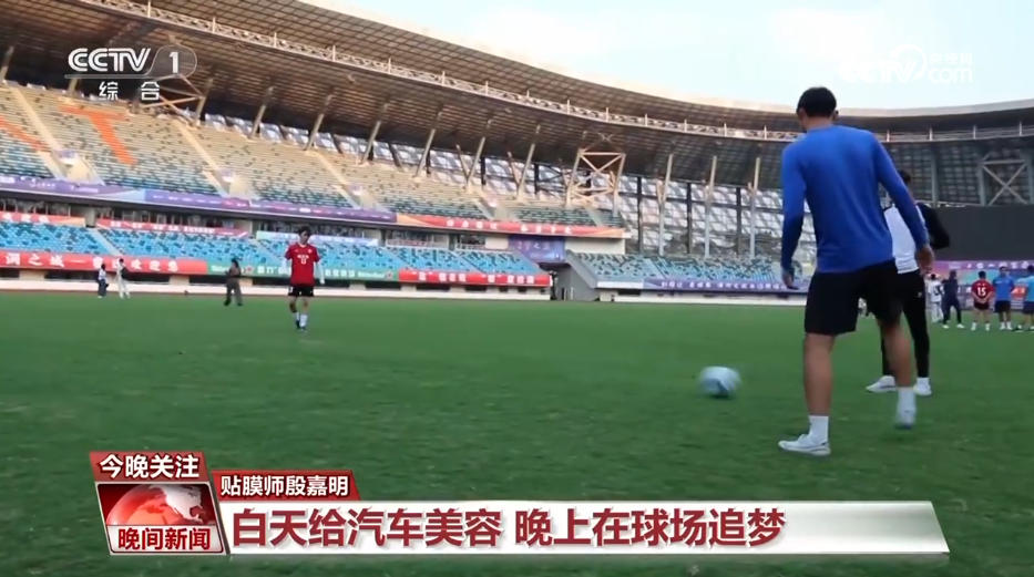 宿迁队队员殷嘉明今年22岁,“苏超”比赛和训练期间,他晚上在绿茵场奔跑追梦,白天做好他的本职工作:汽车贴膜。