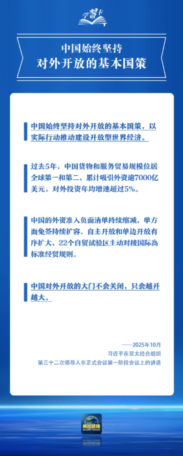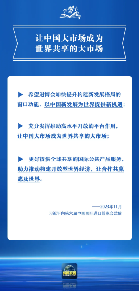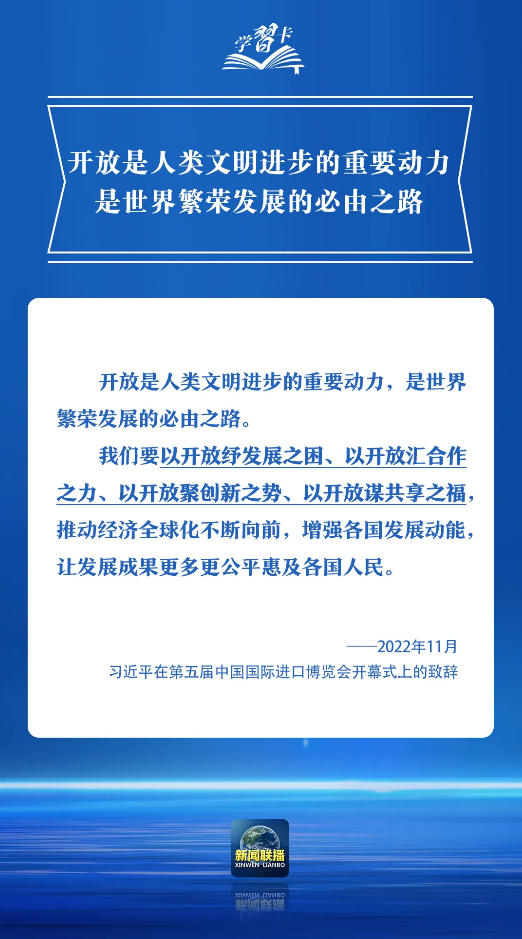 中国是唯一举办国家级国际进口博览会、持续向全世界开放市场的发展中国家。中方不断推进高水平对外开放,同各方在开放联通中相互成就。