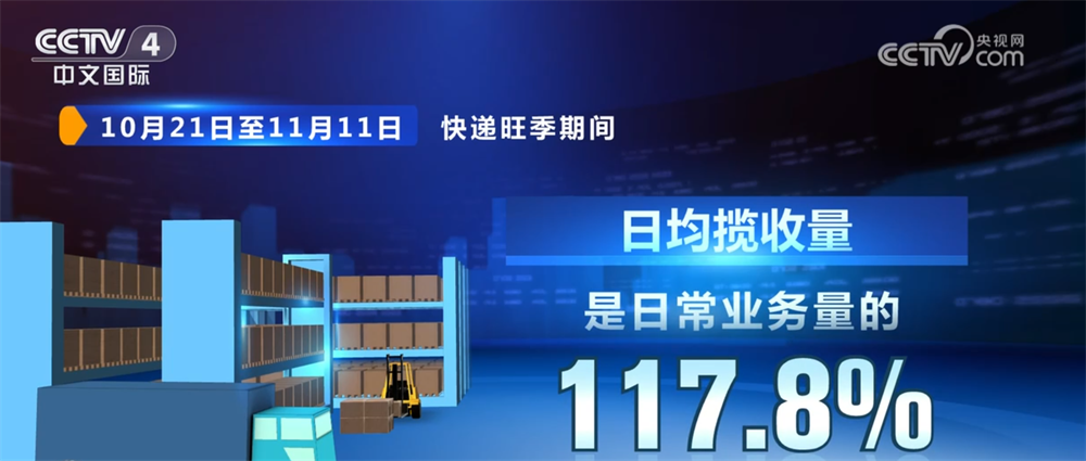 国家邮政局最新数据显示,10月21日至11月11日,快递旺季期间,全国邮政快递企业共揽收快递包裹139.38亿件,日均揽收量是日常业务量的117.8%,旺季单日业务量峰值达7.77亿件,创历史新高。