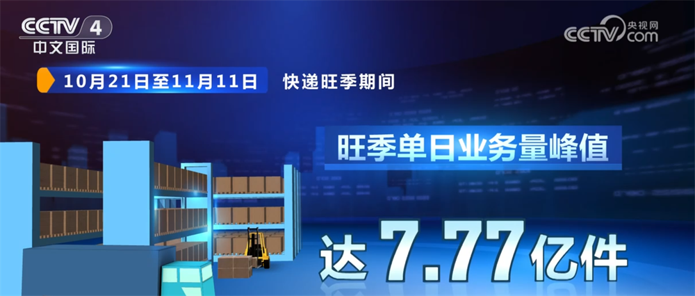 央视网消息:记者从国家邮政局了解到,从10月21日至11月11日,快递旺季期间,中国快递业务量增长明显,单日业务量峰值达7.77亿件,创历史新高。