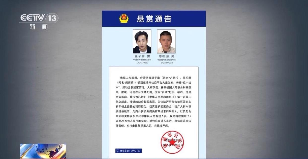2025年11月13日,福建省泉州市公安局发布一则悬赏通告,公开征集台湾网红温子渝(网名“八炯”)、陈柏源(网名“闽南狼”)涉嫌煽动分裂国家的违法犯罪线索。这两个赖清德当局豢养的“台独”打手、帮凶究竟因何获罪?在他们背后又有怎样的动机和企图呢?