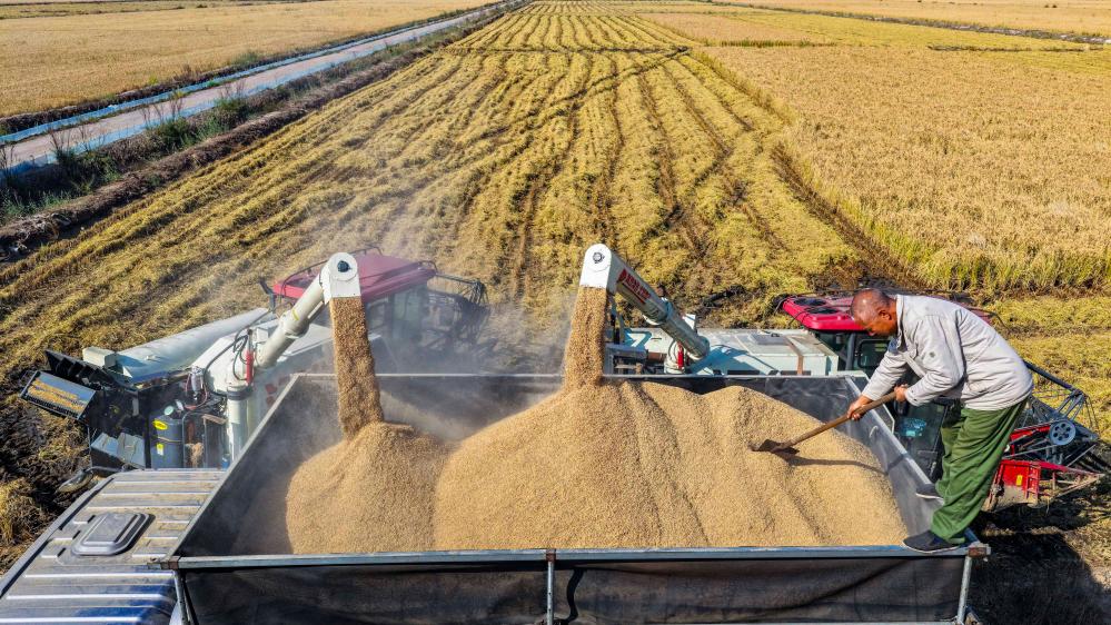 10月27日,河北省唐山市海港经济开发区王滩镇农民将收获的稻谷装车,准备运出稻田晾晒(无人机照片)。新华社发(刘满仓 摄)