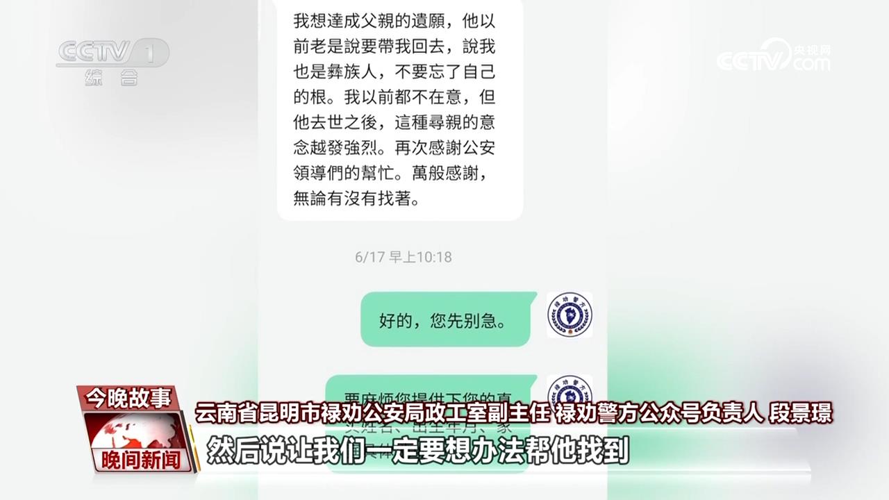 随后,禄劝县公安局为双方安排了视频连线,当分离数十年的亲人隔着屏幕看到对方,血脉亲情冲破了时空的阻隔。