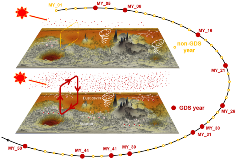 火星,这颗与地球最为相似的“太阳系姊妹星”,始终以其神秘面貌召唤着人类的探索。荒漠之下,或许隐藏着生命起源的线索,也孕育着人类拓展生存边界的希望。然而,火星也潜藏着致命威胁——稀薄的大气、强烈的辐射,以及最令人畏惧的、足以席卷整个星球的巨型沙尘暴。一场突如其来的剧烈沙尘暴,足以让火星探测设备、太阳能电池板和通信系统等设备失灵,令人类的探索任务陷入绝境。从广义上看,火星的沙尘循环系统涵盖了所有与沙尘相关的过程与机制,其中包含各种尺度的沙尘暴。这一系统在塑造火星日常天气的同时,更在其长期气候演化中扮演着核心角色。其中,“随机”爆发的全球性沙尘暴(Global Dust Storm,简称GDS),是典型的极端天气事件,也是引发火星气候出现显著年际变率的主要驱动力。