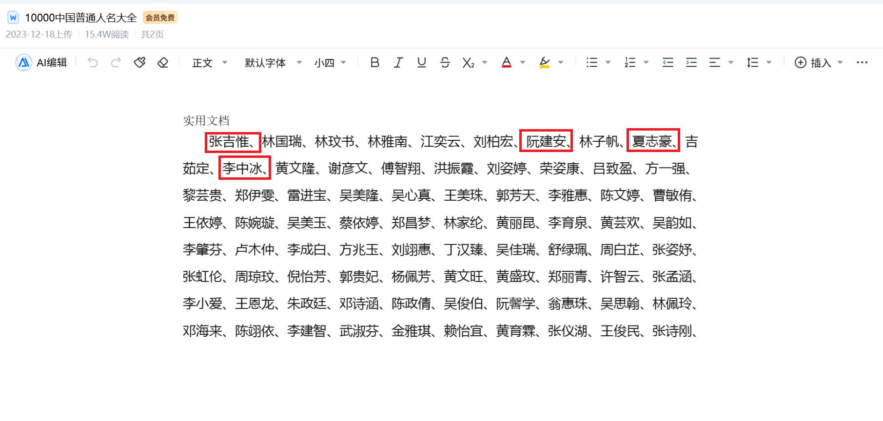 其中的“张吉惟、林国瑞、林玟书、林雅南、江奕云、阮建安、李中冰、夏志豪”,与百度文库《10000中国普通人名大全》开头列出的人名重合。