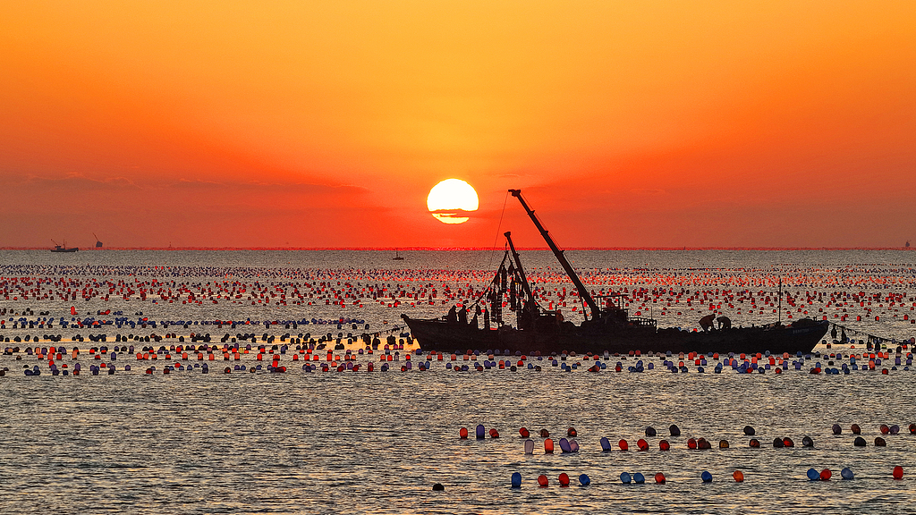 12月5日清晨,山东日照东港区涛雒沿海,一艘艘出海的渔船迎着初升的太阳穿梭在海洋牧场,与金色的朝阳、彩色的浮漂交相辉映,构成了一幅幅美不胜收的海上生态画卷。