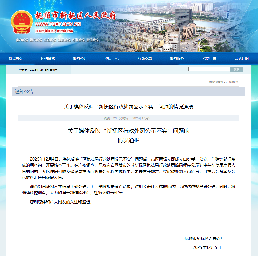 ·抚顺市新抚区人民政府通报“多个明星上了占道经营罚单”:住建局用虚假人名备案,将严肃处理相关责任人。