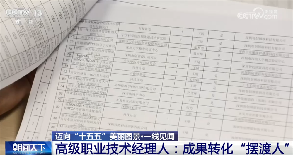 “技术经理人”是“十四五”时期服务科技成果转化过程中产生的一个新职业,专指在高校、科研院所等机构从事技术转移的专业人士,而深圳又创新性地增加了“高级”的认定。在深圳市新质生产力科技促进中心,记者了解到,目前深圳已认定的高级职业技术经理人有300多位,“十五五”期间,这个群体的数量还会不断扩大。负责人给记者看了一个表格,从人工智能、半导体、新材料到生物医药领域的270多个重点项目,全部是高级技术经理人正在跟进的重点项目,大家还可以信息共享,打通各类资源壁垒。