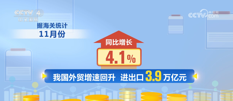 11月份,我国外贸增速回升,进出口3.9万亿元,同比增长4.1%。其中,出口2.35万亿元,增长5.7%;进口1.55万亿元,增长1.7%。