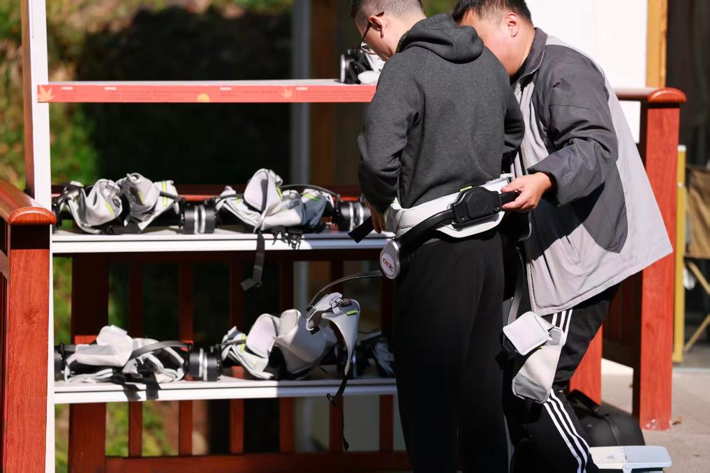 工作人员正在帮助游客穿戴登山助力外骨骼设备。(受访者供图)