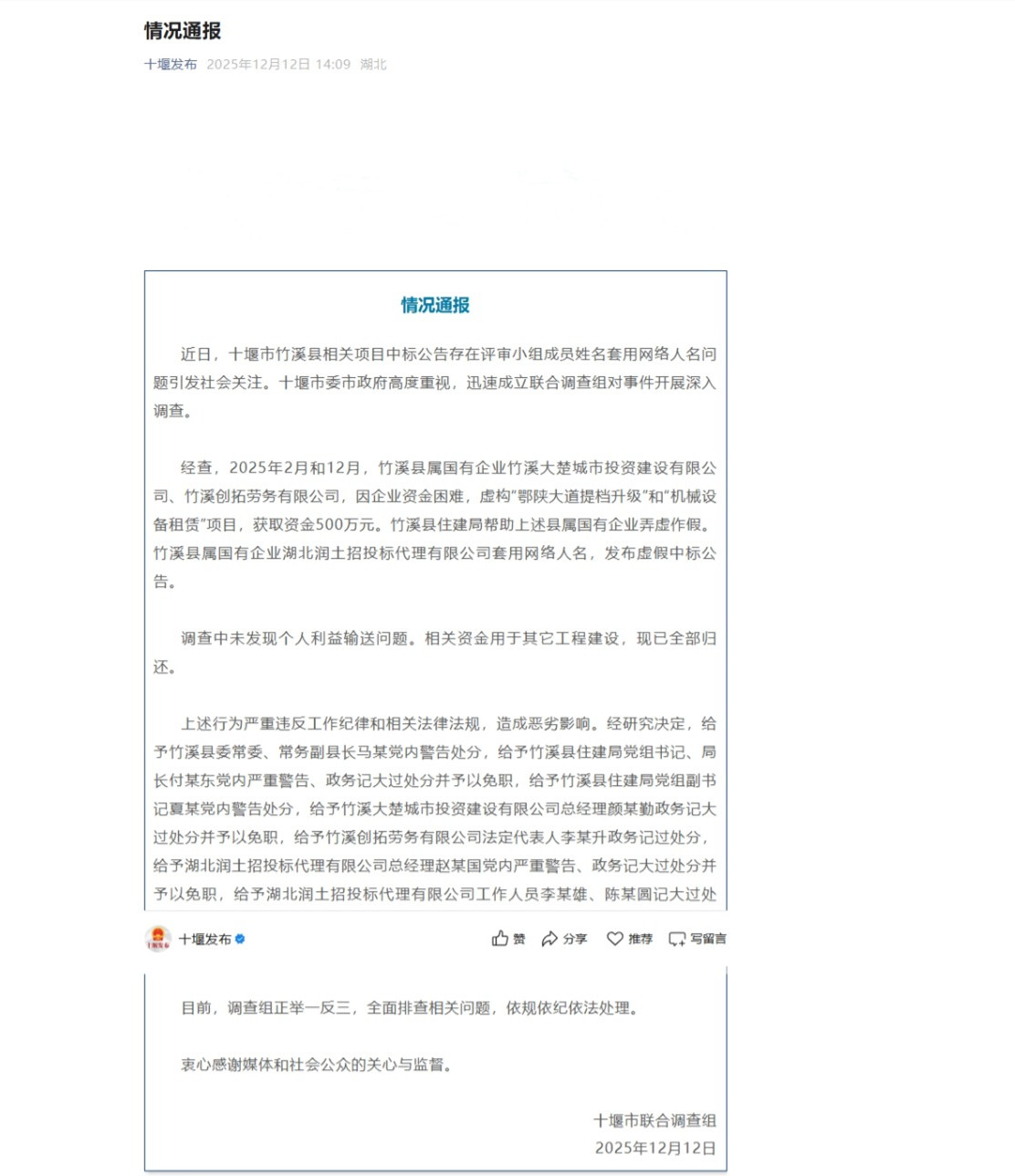 ·十堰通报中标公告现全网最忙5人组:竹溪国企虚构中标获取资金500万,现已全部归还。
