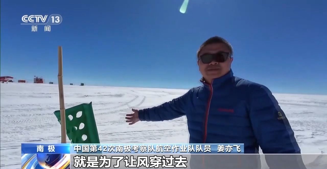 中国第42次南极考察队航空作业队队员 姜亦飞:故意做成这样,就是为了让风穿过。绿色的旗子表示两个绿色旗子之间可以转弯,飞机可以转进去,红色旗子代表跑道尽头。