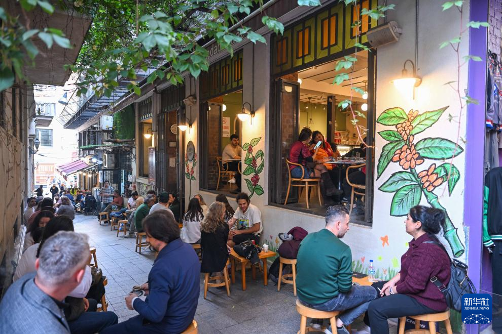 11月22日,顾客们在土耳其伊斯坦布尔的曼达巴特马兹咖啡店外的巷道里喝咖啡。新华社记者 刘磊 摄
