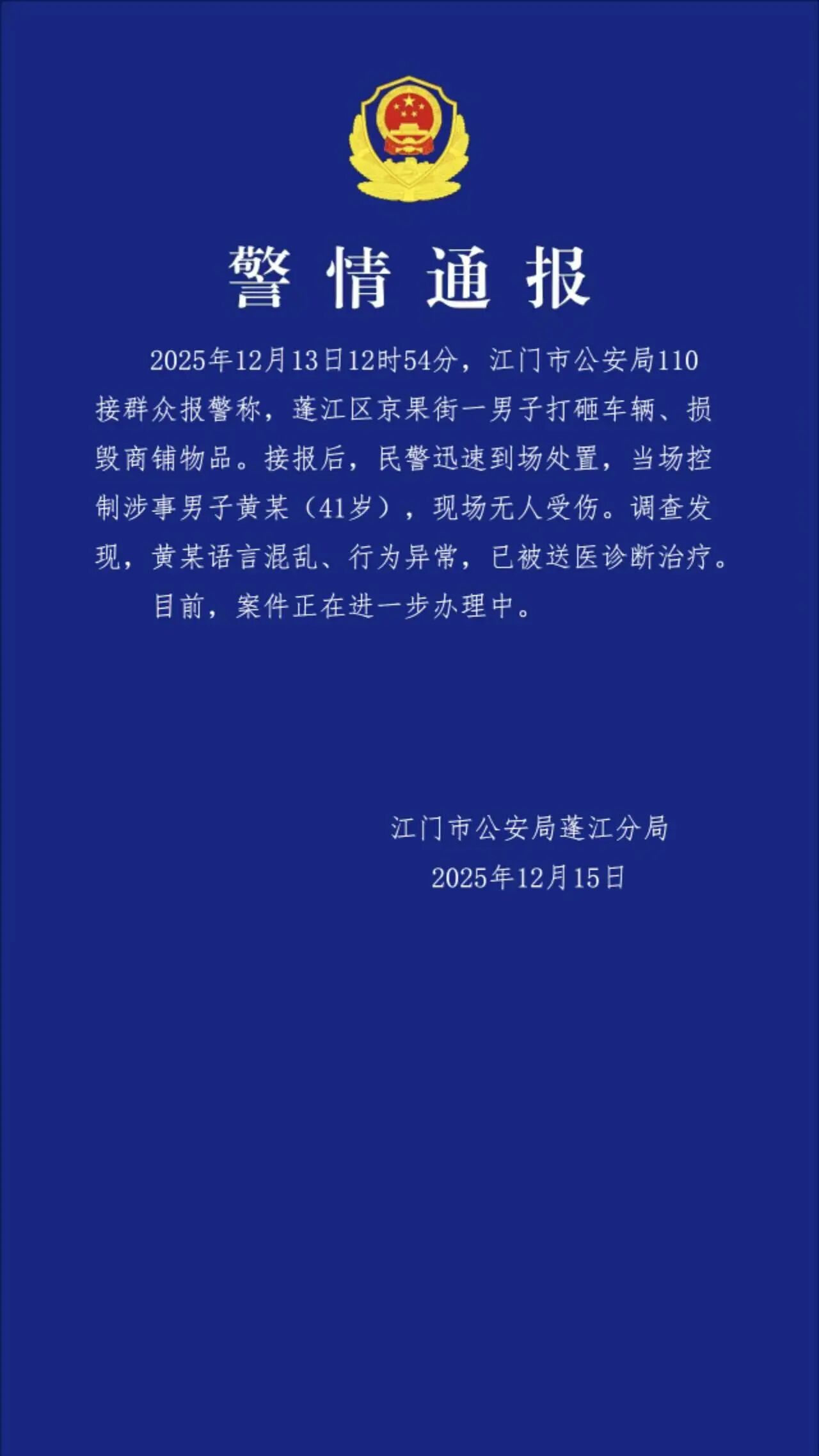 央视网消息:12月15日,广东省江门市公安局蓬江分局发布警情通报:12月13日12时54分,江门市公安局110接群众报警称,蓬江区京果街一男子打砸车辆、损毁商铺物品。接报后,民警迅速到场处置,当场控制涉事男子黄某(41岁),现场无人受伤。调查发现,黄某语言混乱、行为异常,已被送医诊断治疗。目前,案件正在进一步办理中。