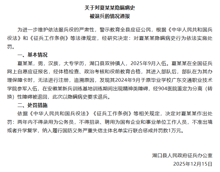 央视网消息:12月15日,江西九江湖口县人民政府征兵办公室发布关于对夏某某隐瞒病史被退兵的情况通报: