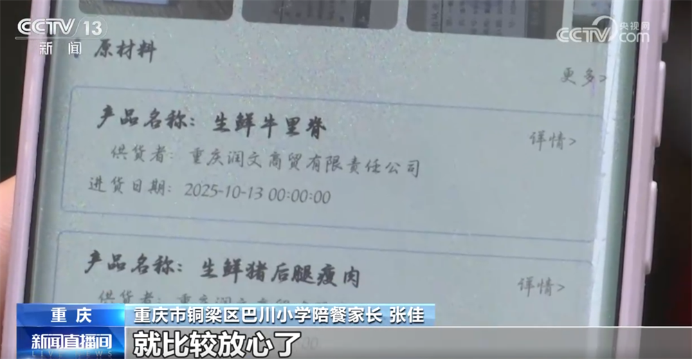 重庆市铜梁区巴川小学陪餐家长张佳称:“像以前可能我们都不太清楚学校到底吃什么,但是现在越来越公开,然后我们也可以在手机平台上都能看到,家长就对小朋友吃的这一方面比较放心了。”