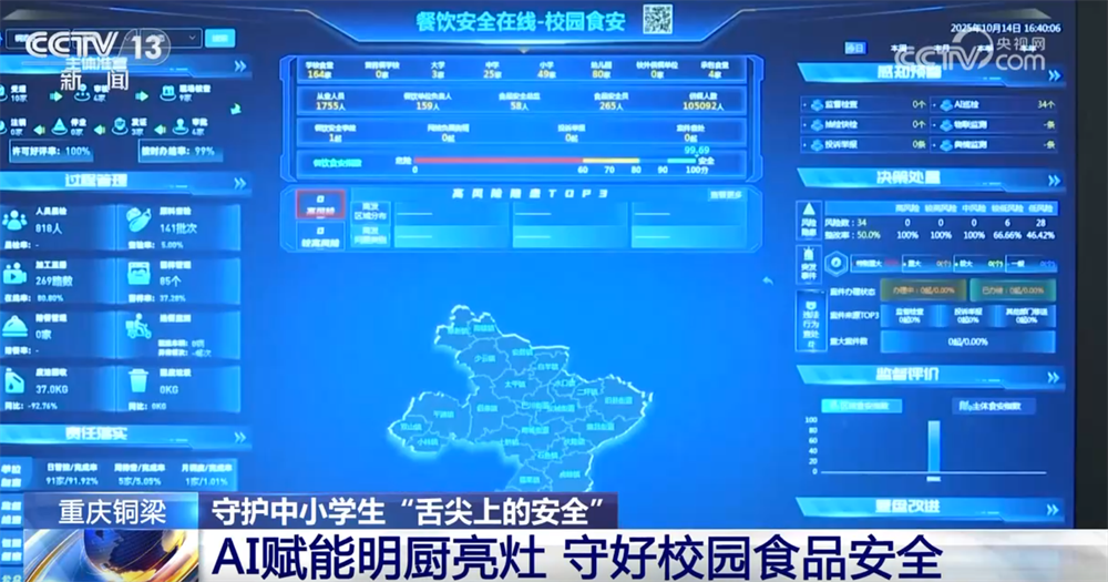 此外,铜梁区还推动“互联网+明厨亮灶”改造升级,通过AI智能抓拍食堂从业人员没有佩戴口罩、帽子等违规操作行为,并及时通过语音播报进行提醒,避免食材加工环节容易出现的不卫生等问题,守好食品安全。