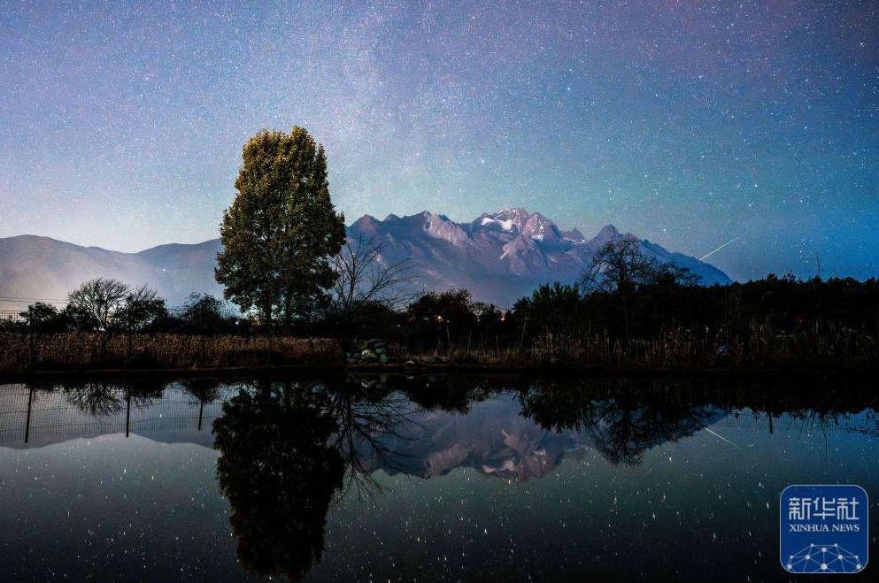 14日凌晨在云南省丽江市玉龙雪山脚下拍摄的双子座流星雨。