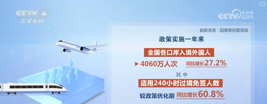 国家移民管理局统计显示,政策实施一年来,全国各口岸入境外国人4060万人次,同比增长27.2%。其中,适用240小时过境免签人数较政策优化前同比增长60.8%。